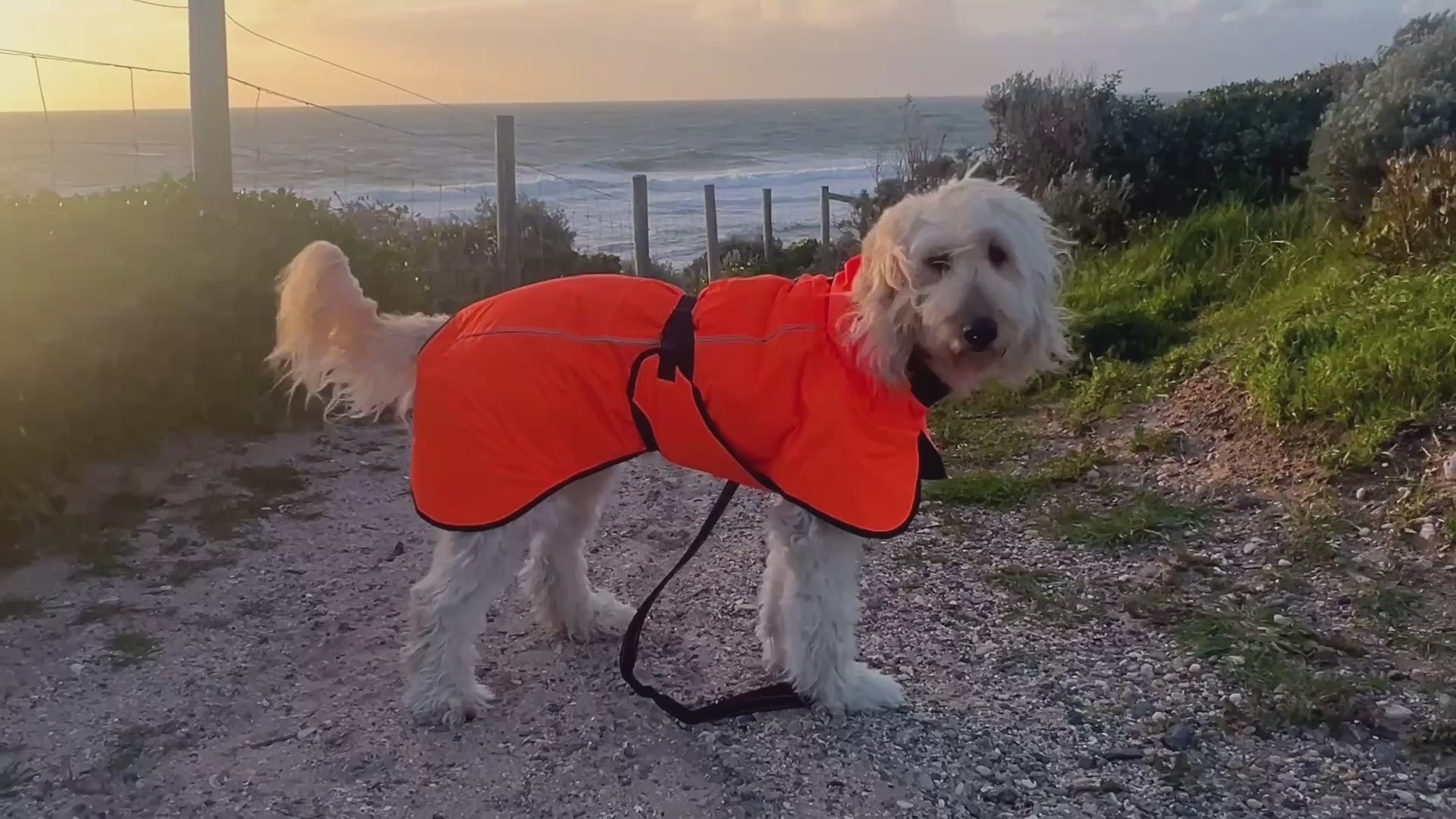 Dog Coats with high visibility for walking coat in glowing orange with reflective piping. Showerproof (if you want full on waterproof please purchase one of our raincoats).
