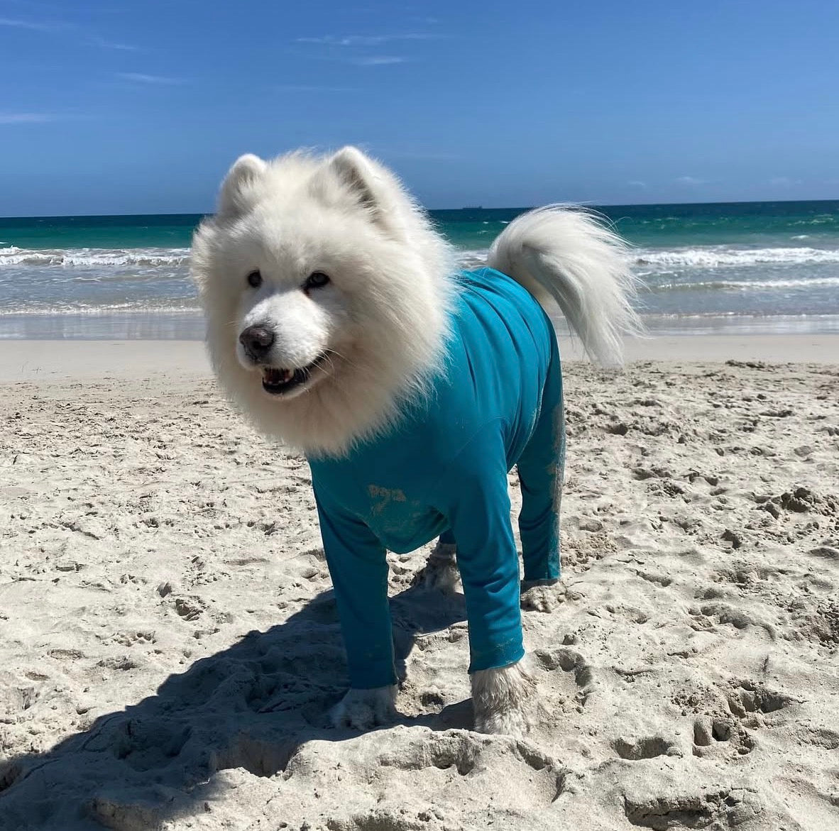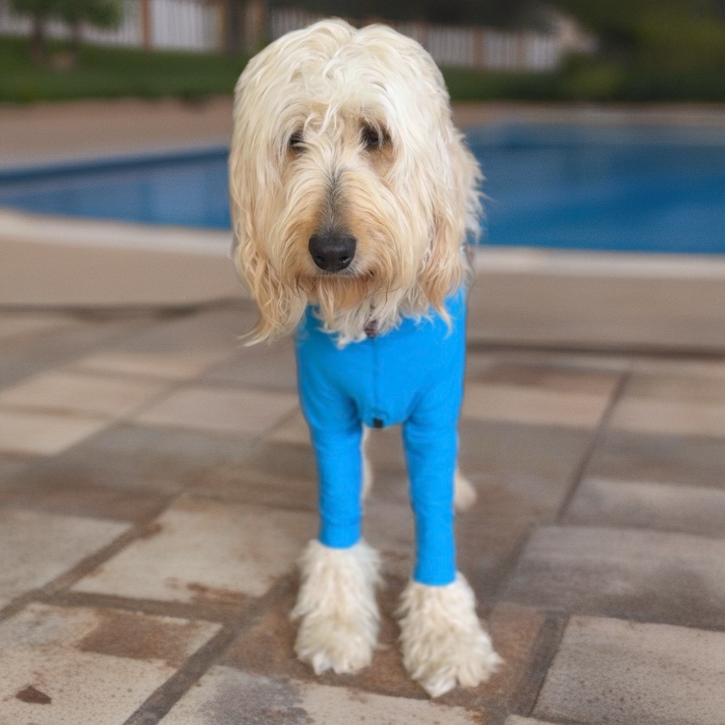 Surfdog Superfit dog body suit offers UV sun protection, allergy relief & post-surgery healing. Also major reduction in sand loading for long or heavy coated dogs. Wear the Body Suit and yo only have the paws to wash!