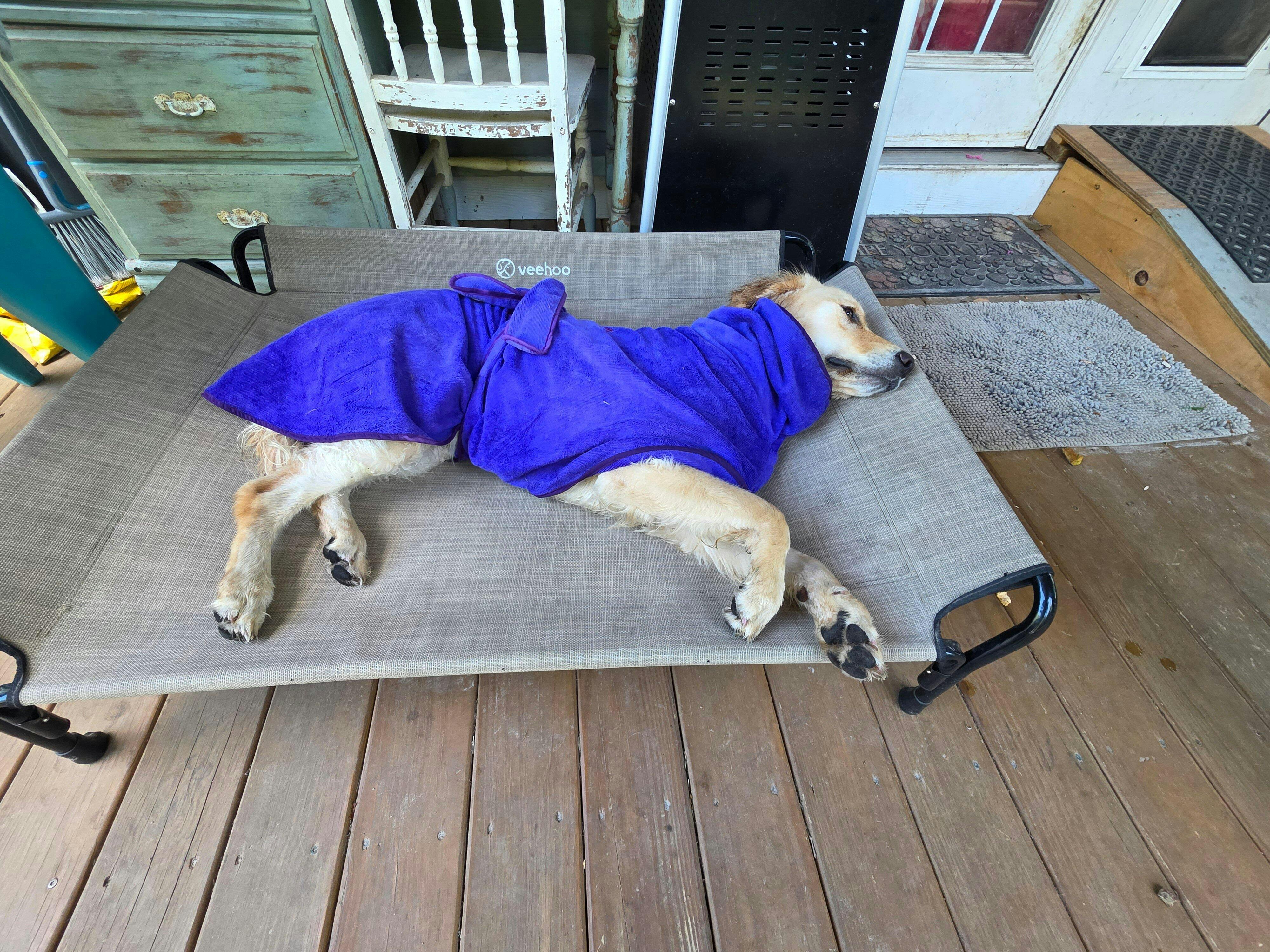 - Comfort. The coat wraps your dog up like a big hug to dry. Without any fiddly fastenings. Customers even use them as Thunder Coats. Nothing to flap, pull or pinch.